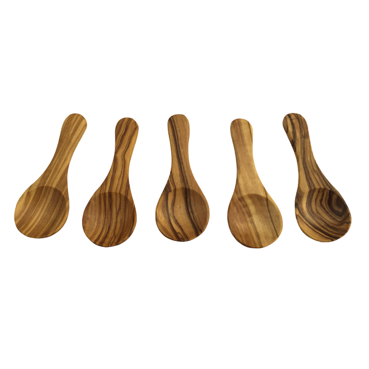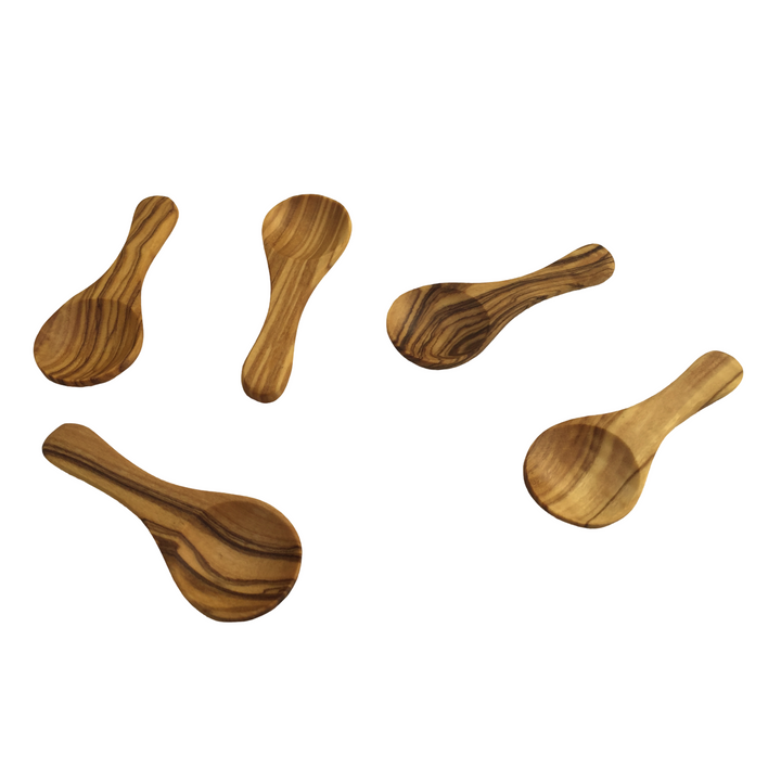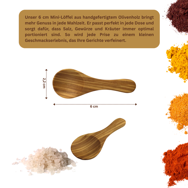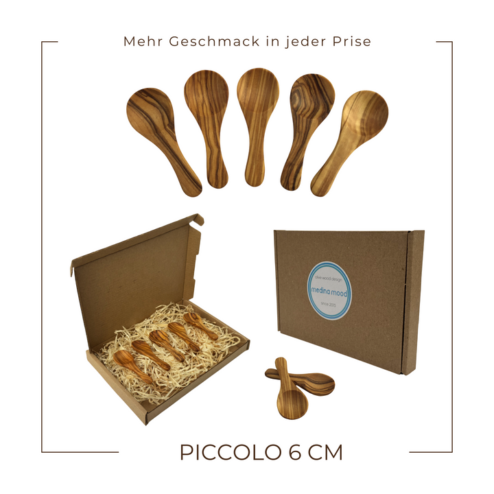 Dieses 5er-Set hochwertiger Mini-Löffel wird in liebevoller Handarbeit aus edlem Olivenholz gefertigt. Jedes Stück ist ein Unikat mit einer individuellen Maserung und Farbgebung. Das gezeigte Produktbild dient als Beispiel – das gelieferte Set kann in Form, Maßen und Maserung leicht variieren. Perfekt für die präzise Dosierung von Salz, Gewürzen und Kräutern – dank seiner kompakten Größe passt der Löffel mühelos in jede Dose. Vielseitig einsetzbar, bringt er mediterranen Charme auf jeden Tisch und ist ein stilvolles Detail für jede Küche. Perfekt für die Dosierung von: - Salz, Gewürzen und Kräutern. - Tee, Kaffee oder Zucker. - Honig, Marmelade oder Dips. Natürlich & vielseitig: Die Mini-Löffel passen ideal in kleine Dosen und bringen mediterranen Charme auf jeden Tisch.
