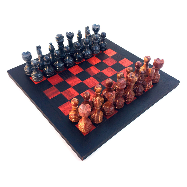 Schachspiel gerade Kante, Schachbrett Größe wählbar inkl. 32 Schachfiguren aus Marmor Handgemacht aus Wenge und rotes Holz